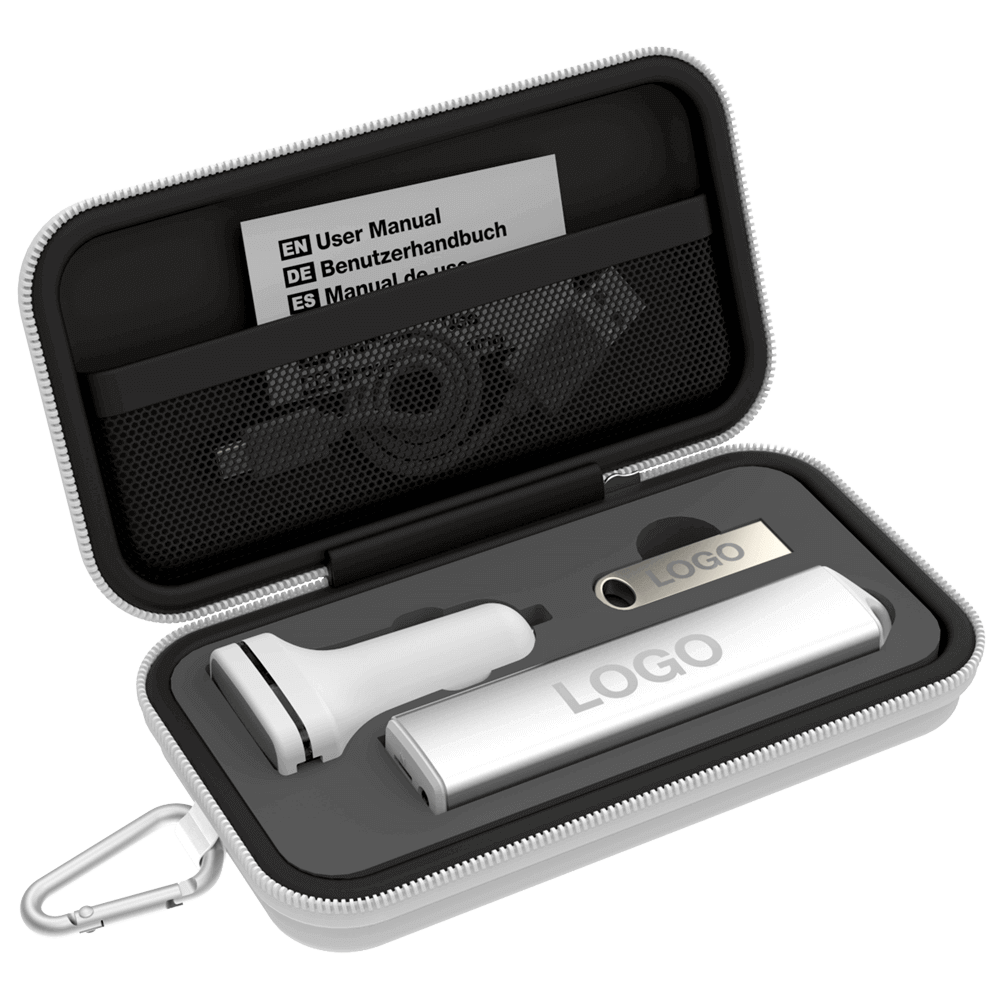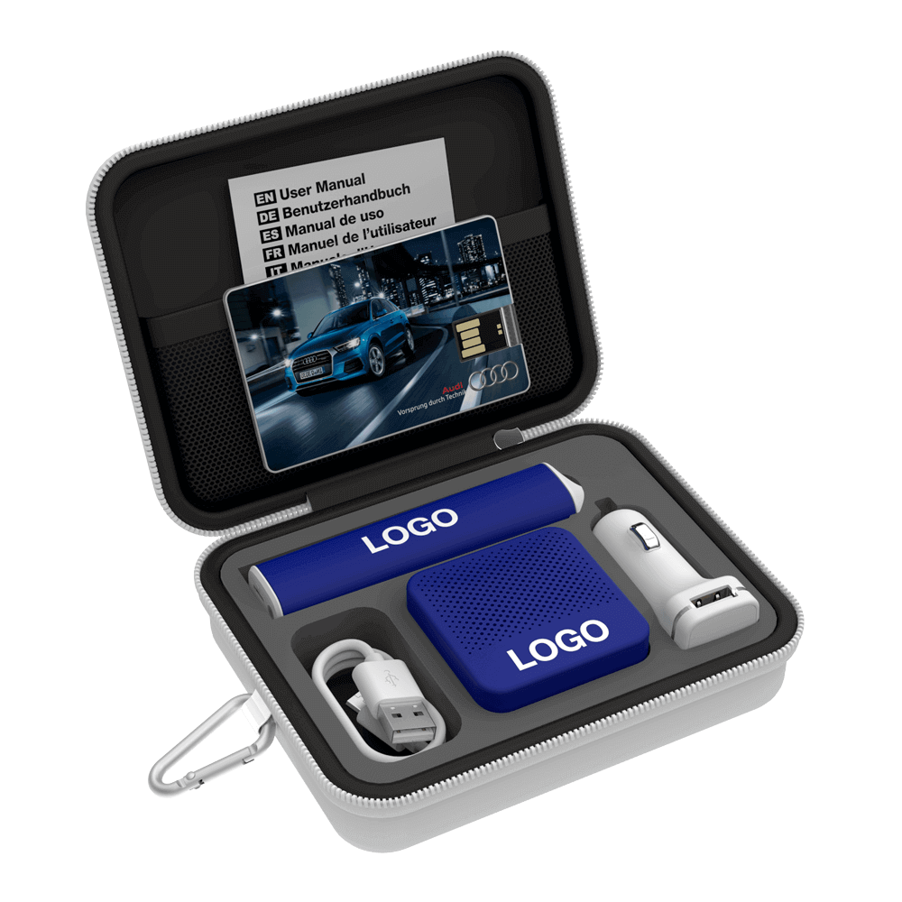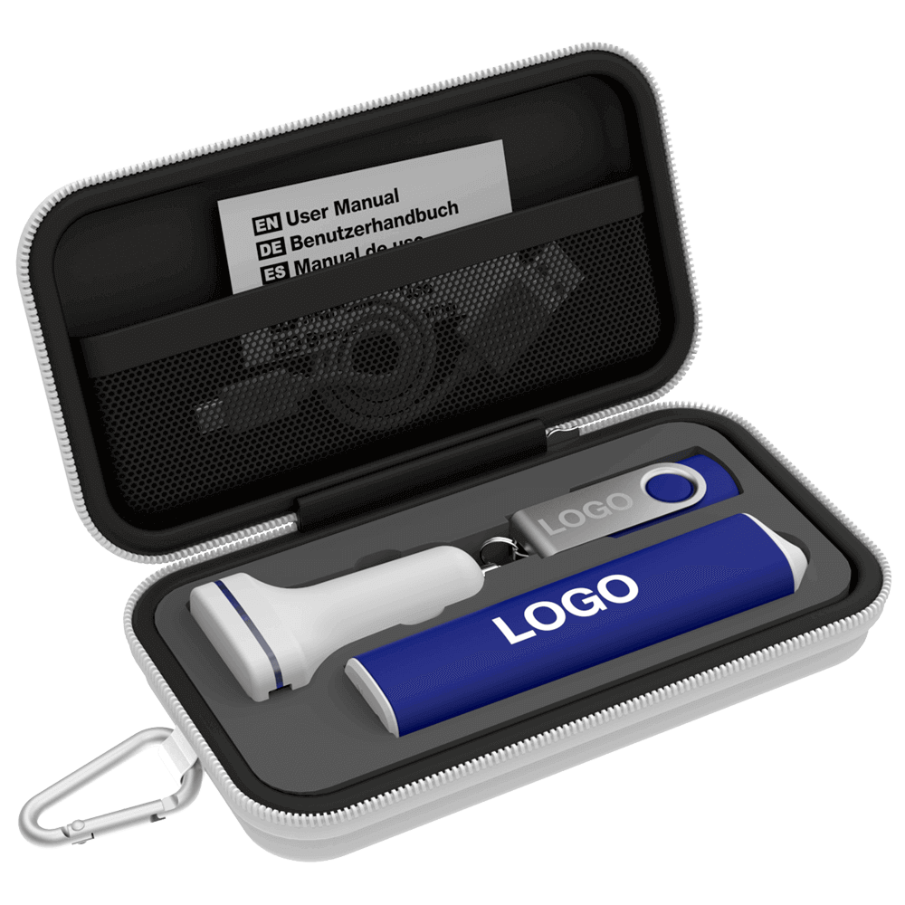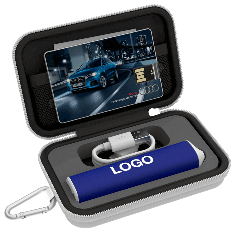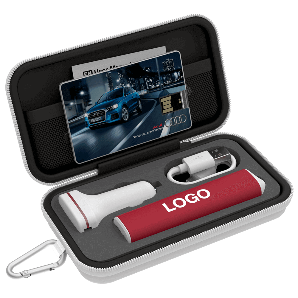 Speziell für Werbeaktionen entwickelt, kann das großartige Reisegeschenkset mit Ihrem Logo und Slogan bedruckt werden. Erhältlich in 3 Größen und mit folgendem Inhalt: - Geschenkset S: 1x USB Stick und 1x Powerbank, Geschenkset M: 1x USB Stick, 1x Powerbank und 1x USB-Kfz-Ladegerät, Geschenkset L: 1x USB Stick, 1x Powerbank, 1x USB-Kfz-Ladegerät und 1x Bluetooth® Lautsprecher. Jedes Geschenkeset kommt mit eigenen Karabiner.