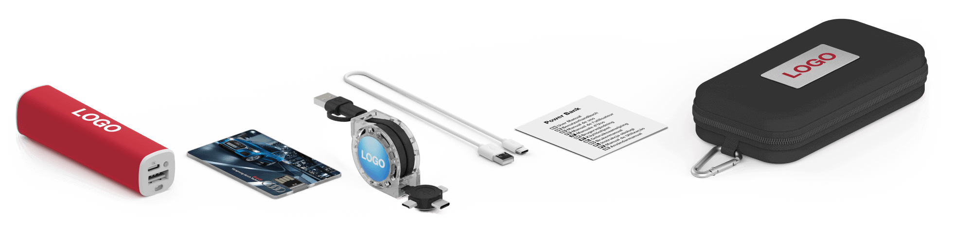 Kombinieren Sie 3 Produkte in 1 handlichem Geschenkset: Wafer USB Karte, Core Powerbank, Motion USB Kabel. Die sorgfältig zusammengestellten Produkte in den Geschenksets können mit Ihrem Logo, Slogan, Kontaktdaten und Statements versehen werden. Die Oberfläche des Geschenksets kann mittels Lasergravur oder im Siebdruck, mit bis zu 4 Farben, gestaltet werden. Jegliche Farbkombinationen sind erlaubt.