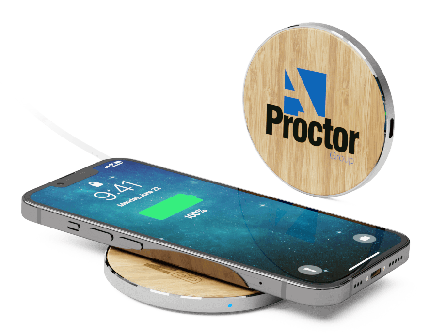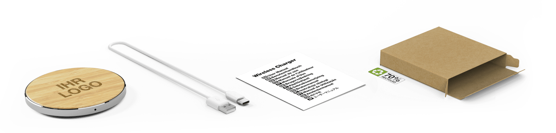 Das natürliche Bambusholz-Finish bildet einen auffälligen Kontrast zu lebendigen Markenbildern und bringt Ihr Unternehmen in Einklang mit umweltfreundlichen Werten. Entscheiden Sie sich für unseren Individual Naming Service, um personalisierte kabellose Ladegeräte für die Aufnahme von Kunden oder Mitarbeitern zu erstellen. Oder nummerieren Sie Ihre Geräte zur Datenerfassung für Ihre nächste Messe oder Veranstaltung. Das kabellose Ring-Ladegerät ist auch Teil unserer neuen Merch-Pakete, die sich perfekt als Geschenk für Mitarbeiter und Kunden eignen!