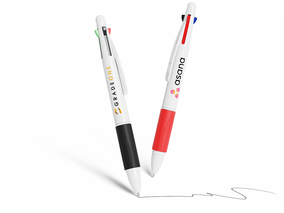 Der Quad ist ein klassischer 4-Farben-Stift mit blauer, roter, grüner und schwarzer Mine in einem Modell. Jede Farboption lässt sich über die Klickschieber an der Oberseite des Stifts ein- und ausfahren. Der bequeme Gummigriff ist in einer Vielzahl von Farben erhältlich, passend zu Ihrem eigenen Stil. Die weiße Außenhülle kann per Fotodruck mit Ihrem Logo, Slogan und mehr versehen werden.