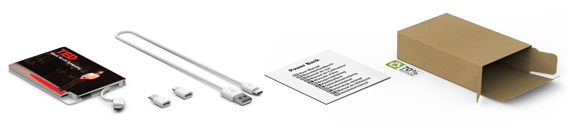 Die Card ist eine kleine Powerbank, die es in sich hat. Sie ist das perfekte Werbegeschenk für einen Messestand oder ein Mitarbeitergeschenk, um sicherzustellen, dass der Akku des Telefons voll aufgeladen und für wichtige Anrufe und Meetings einsatzbereit bleibt. Ausgestattet mit einem Micro-USB-Kabel mit Lightning- und USB-C-Adapter ist das Gerät mit allen wichtigen Marken mobiler Geräte kompatibel, von Handys bis hin zu Tablets.