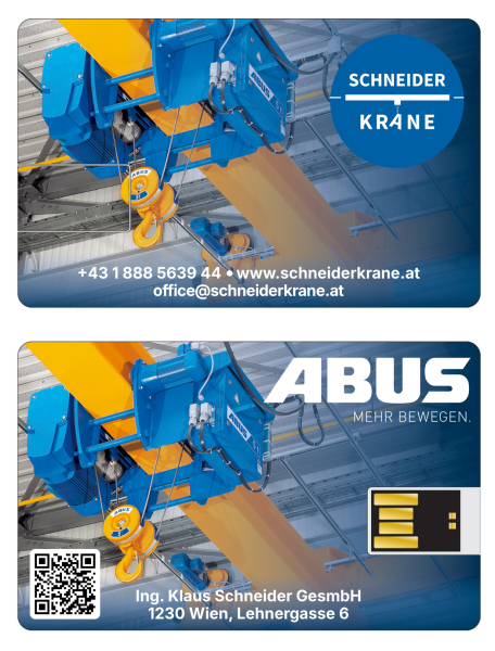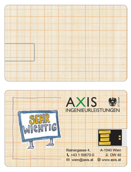 Die Wafer-USB-Karte ist in verschiedenen Speicherkapazitäten von 2 GB bis zu 128 GB erhältlich und eignet sich somit perfekt für die Speicherung großer Dateien oder Präsentationen. Nutzen Sie unsere Datenaufspielung und lassen Sie uns Ihre Dateien für Sie auf die Karten hochladen.