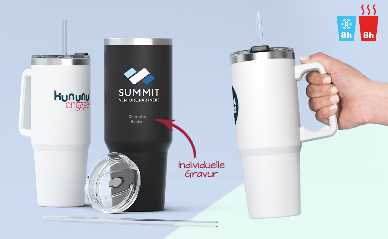 Die Gravur schafft eine permanente Form der Namenskennzeichnung. Das ist ideal für Sportvereine und Schulen, um Verwechslungen von Trinkflaschen oder Reisebechern beim Training oder Wettkampf zu vermeiden. Jeder einzelne Name wird zusammen mit Ihrem Logo und Slogan auf dem Drinkware-Produkt angebracht.