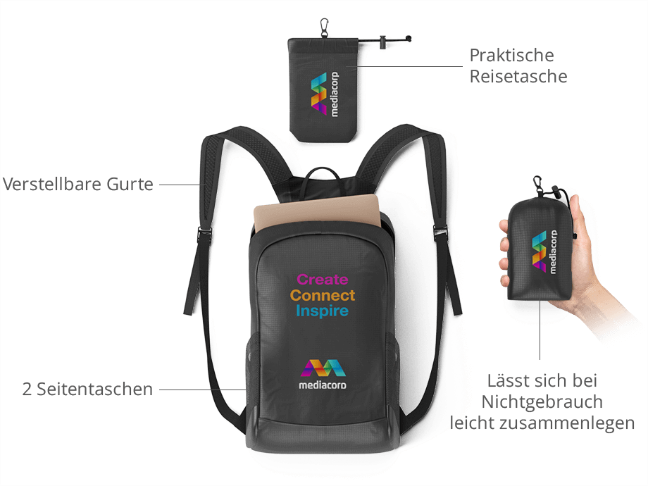 Dieser leichte Rucksack aus strapazierfähigem Polyester hat ein praktisches, faltbares Design, mit dem er bei Nichtgebrauch einfach in seinen eigenen Packsack gepackt werden kann. Das macht ihn zum idealen Reisebegleiter für Ihre Kunden und Mitarbeiter, egal ob sie zur Arbeit pendeln oder einen Wochenendausflug machen.