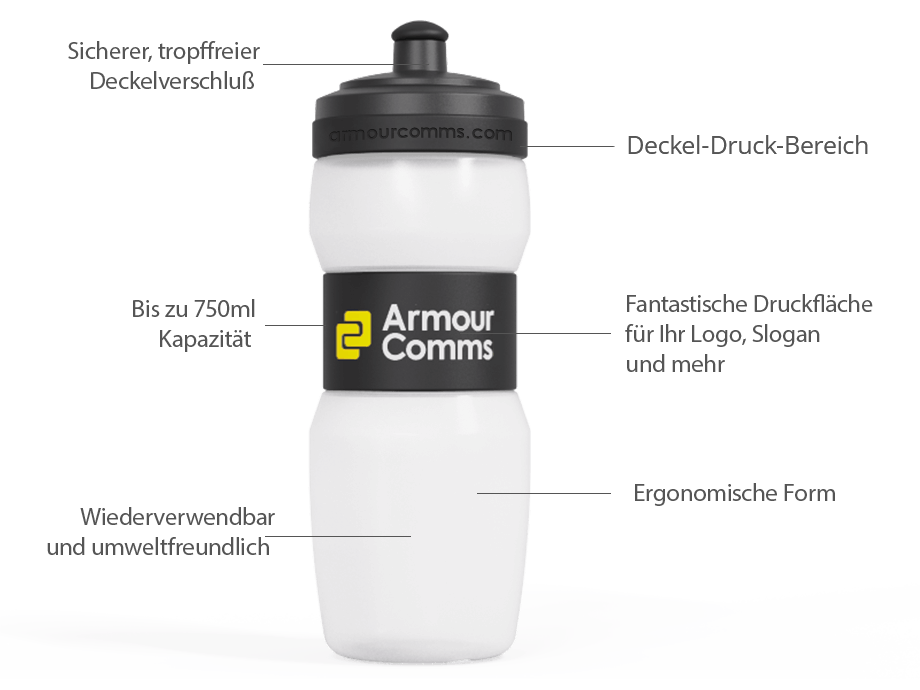Unsere Fit-Wasserflasche ist ein Muss für Ihre nächste Konferenz oder Veranstaltung. Der Handgriff kann mit Ihrem Logo als Siebdruck versehen werden. Ebenso können wir die Seite des Deckels mit Ihrer Internetadresse oder Ihrem Slogan gravieren. Die Fit ist entweder in den Größen 500 ml oder 750 ml erhältlich. Der auslaufsichere Deckel verfügt über eine weiche Kappe an der Trinköffnung für mehr Komfort.